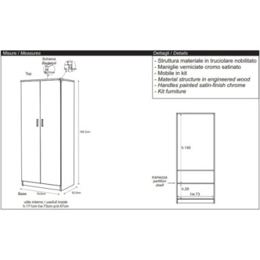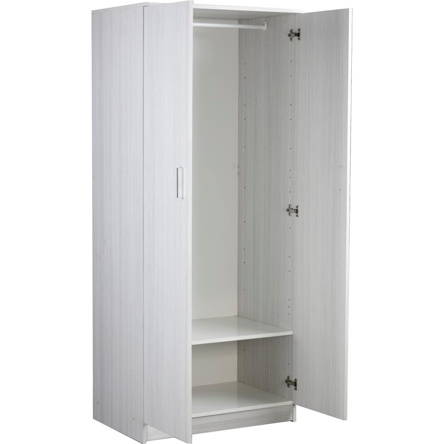 Una soluzione elegante per riporre i tuoi vestiti, questo armadio a due ante offre un ampio potenziale di archiviazione in un design contemporaneo. Disponibile in una gamma di finiture per adattarsi al tuo arredamento esistente. Struttura e frontali sp. 16mm. Contiene 1 barra portabiti, 1 ripiano fisso ed 1 regolabile. Maniglie verniciate cromo satinato. Mobile in kit. Misure: 182x77x52 Colore Struttura/Structure - Frontale/Front: Bianco Lisco / Smooth White - Bianco Lisco / Smooth White