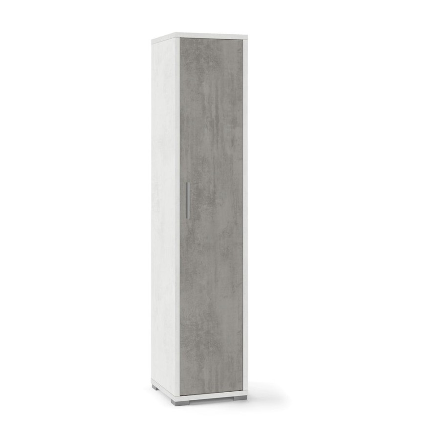 Con il suo design inconfondibile, questa libreria aggiunge un tocco di stile all'ambiente circostante. la libreria presenta cinque livelli ideali per esporre non solo libri ma arte, piante d'appartamento, dischi, elettronica e altro ancora. Struttura sp. 25mm e ripiani sp. 18mm, anta sp. 16mm, bordi in ABS. Interno: 2 ripiani regolabili e 2 fissi. Maniglia e piedini verniciati cromo satinato. Mobile in kit. Misure: 182x39x41 Colore Struttura/Structure - Frontale/Front: Ossido Bianco / Oxide White - Cemento / Beton