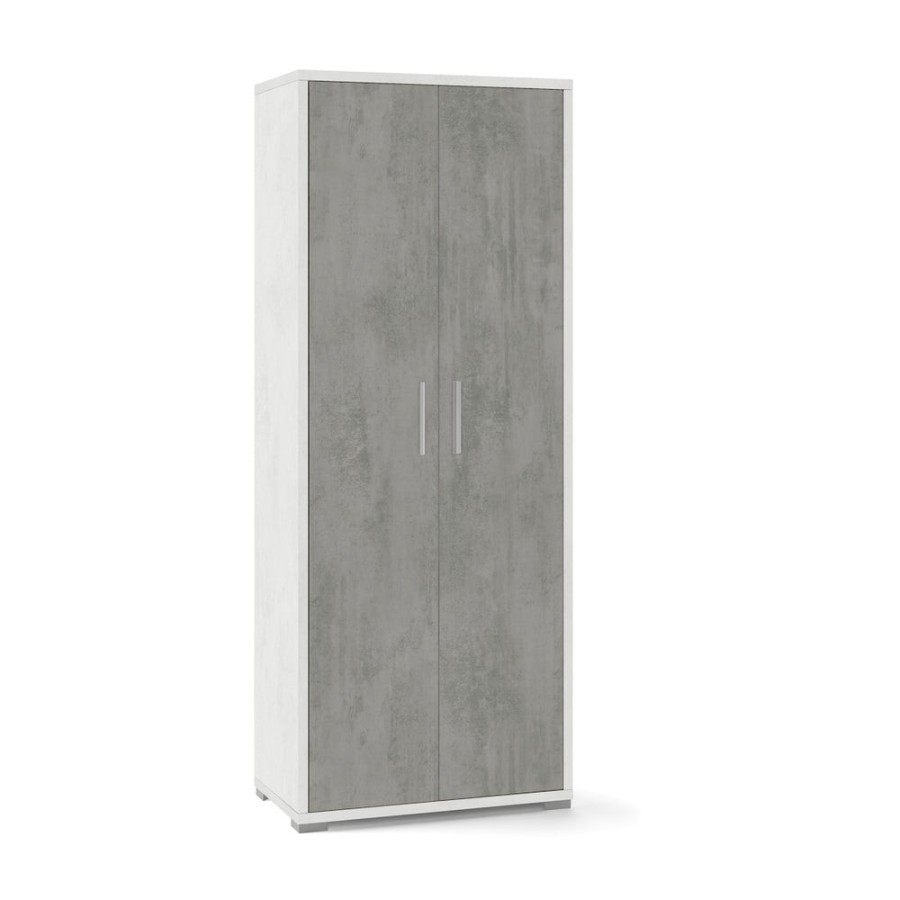 Offrendo soluzioni di archiviazione dal design contemporaneo, questo mobile è disponibile in varie combinazioni di colori che completano il tuo arredamento. Struttura sp. 25mm e ripiani sp. 18mm, ante sp. 16mm, bordi in ABS. Interno: 2 ripiani regolabili e 2 fissi. Maniglie e piedini verniciati cromo satinato. Mobile in kit. Misure: 182x71x41 Colore Struttura/Structure - Frontale/Front: Ossido Bianco / Oxide White - Cemento / Beton