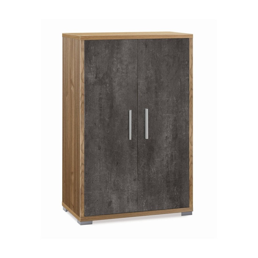 Risolvi i problemi di archiviazione con un tocco di classe utilizzando questo mobiletto, che presenta un'elegante finitura e dettagli accattivanti sulla maniglia satinata. Ricco di fascino urbano, il baule ha due ripiani ideali per riporre ciò che ami. Struttura sp. 25mm ed ante sp. 16mm, bordi in ABS. Interno: 2 ripiani regolabili. Maniglie e piedini verniciati cromo satinato. Mobile in kit. Misure: 110x71x41 Colore Struttura/Structure - Frontale/Front: Noce Stelvio / Stelvio Walnut - Ossido Nero / Oxide Black
