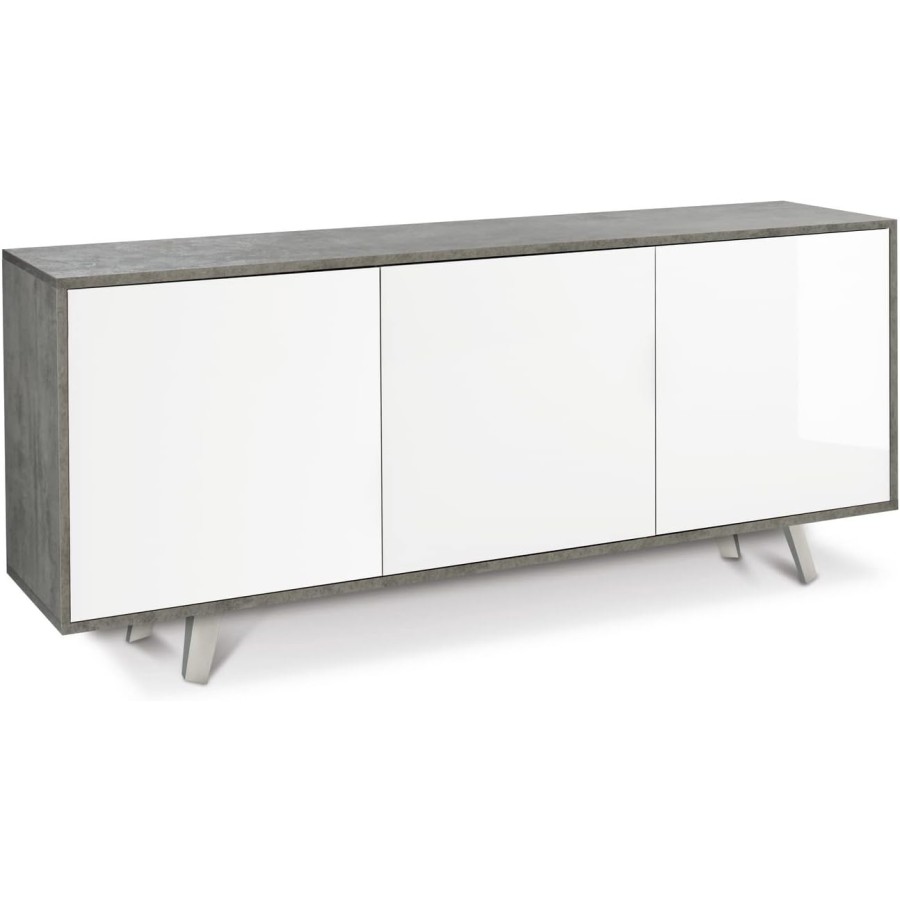 Questa madia di design è una soluzione elegante per il tuo soggiorno, l'accostamento della struttura a contrasto con il frontale, trasformerà il tuo soggiorno tradizionale in uno moderno. Dotato di tre ante con apertura push-pull. Struttura sp. 18mm e frontali sp. 16mm, fianchi e top a vista, bordi ABS. Push-pull. Contiene 2 ripiani regolabili. Piedini verniciato cromo satinato. Mobile in kit. Misure: 74x177x41 Colore Struttura/Structure - Frontale/Front: Cemento / Beton - Bianco Lucido / Gloss White