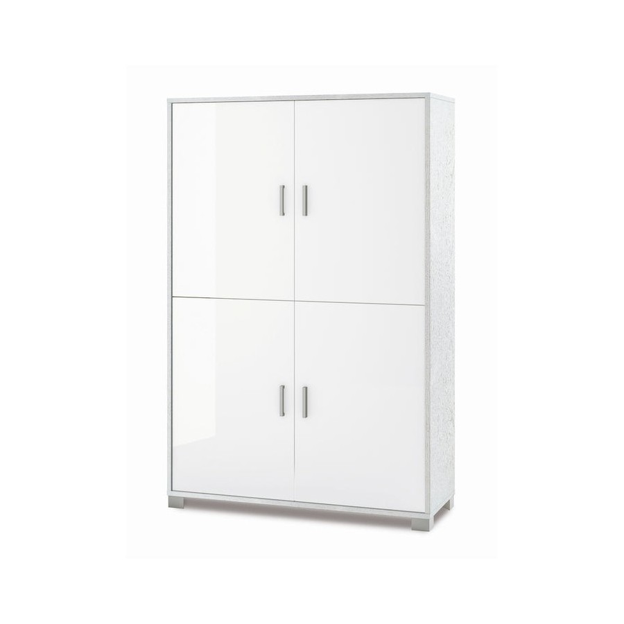 Questo armadio a 4 ante è un'aggiunta durevole ed elegante a ogni ambiente, mantenendo il tuo spazio pulito e ordinato con facilità. È realizzato con una struttura resistente. Un modo semplice per portare uno stile elegante nel tuo spazio abitativo. Struttura sp. 18mm ed ante sp. 16mm, bordo ABS. Contiene 4 ripiani regolabili. Maniglie e piedini verniciati cromo satinato. Mobile in kit. Misure: 161x108x41 Colore Struttura/Structure - Frontale/Front: Bianco Fiammato / White Ash - Bianco Lucido / Gloss White