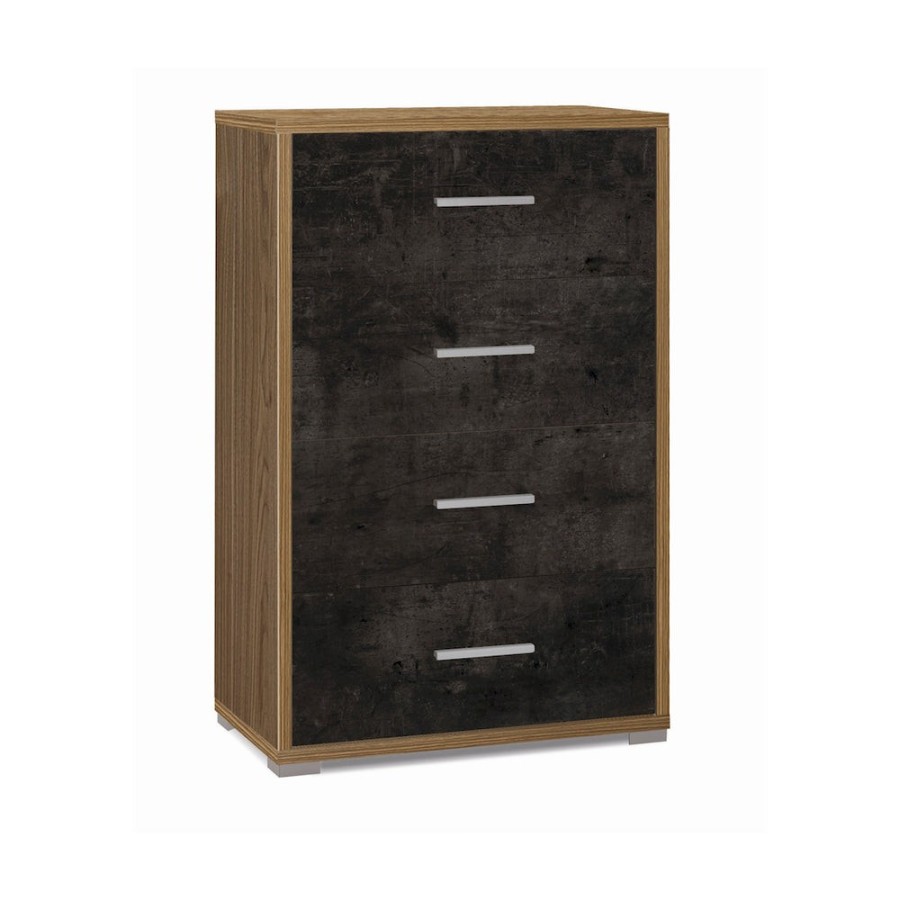 Questa cassettiera ha molto spazio per un uso ufficio ma anche per riporre vestiti piegati, biancheria da letto e altro ancora. Ha quattro cassetti che si trovano su guide metalliche per un funzionamento regolare. Stile contemporaneo, urban. Struttura sp. 25mm e cassetti sp. 16mm, bordi in ABS. Guide cassetto a rullo. Maniglie e piedini verniciati cromo satinato. Mobile in kit. Misure: 110x71x41 Colore Struttura/Structure - Frontale/Front: Noce Stelvio / Stelvio Walnut - Ossido Nero / Oxide Black