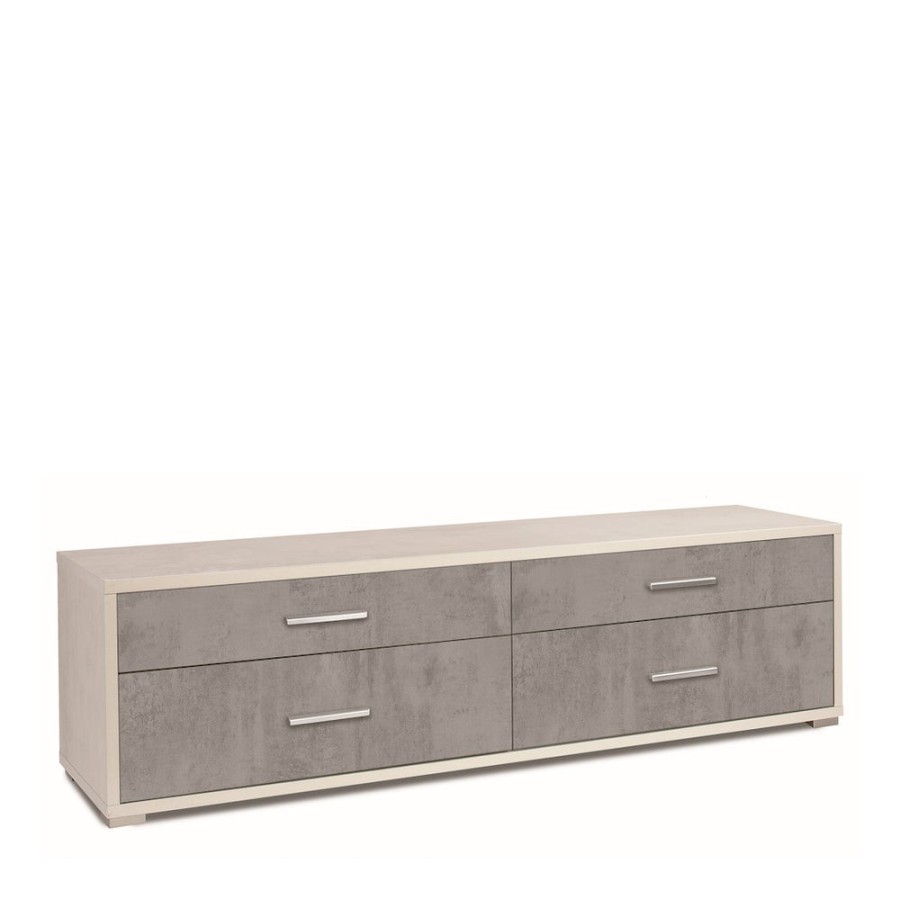 Questa cassettiera unisce praticità e design moderno. Realizzato in legno composito, è attrezzato con quattro cassetti molto capienti. Ognuno di questi ha una maniglia color grigio satinato e si trova su guide a rulli di facile scorrimento. Grazie alle sue dimensioni, si adatta molto bene ad un soggiorno come porta tv. Nel frattempo, il suo design minimalista assicura che si integri perfettamente negli interni contemporanei. Struttura sp. 25mm e cassetti sp. 16mm, bordi in ABS. Guide cassetto a rullo. Maniglie e piedini verniciati cromo satinato. Mobile in kit. Misure: 50x179x47 Colore Struttura/Structure - Frontale/Front: Ossido Bianco / Oxide White - Cemento / Beton