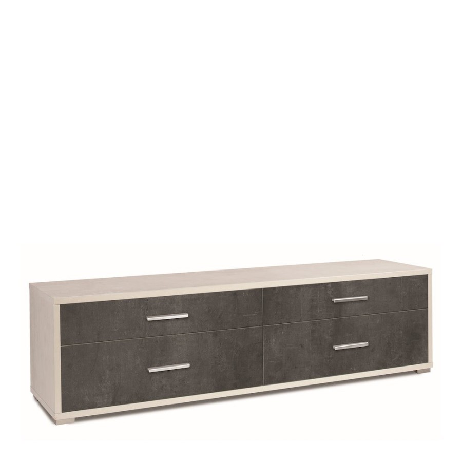Questa cassettiera unisce praticità e design moderno. Realizzato in legno composito, è attrezzato con quattro cassetti molto capienti. Ognuno di questi ha una maniglia color grigio satinato e si trova su guide a rulli di facile scorrimento. Grazie alle sue dimensioni, si adatta molto bene ad un soggiorno come porta tv. Nel frattempo, il suo design minimalista assicura che si integri perfettamente negli interni contemporanei. Struttura sp. 25mm e cassetti sp. 16mm, bordi in ABS. Guide cassetto a rullo. Maniglie e piedini verniciati cromo satinato. Mobile in kit. Misure: 50x179x47 Colore Struttura/Structure - Frontale/Front: Ossido Bianco / Oxide White - Ossido Nero / Oxide Black