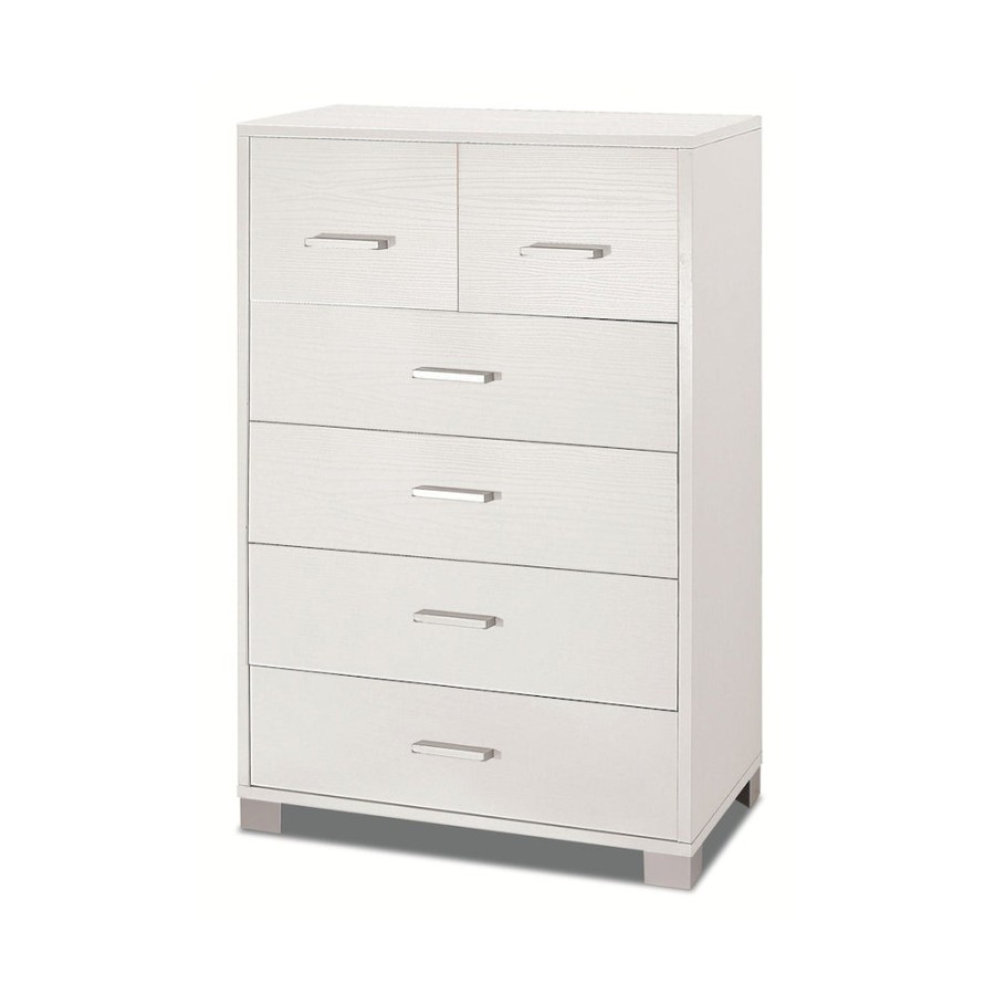 Questa cassettiera unisce praticità e design moderno ed è attrezzata con sei cassetti, ognuno di questi ha una maniglia color grigio satinato e si trova su guide a rulli di facile scorrimento. Grazie alla sua forma, la cassettiera offre molto spazio per riporre vestiti, biancheria e altri oggetti. Nel frattempo, il suo design minimalista assicura che si integri perfettamente negli interni contemporanei. Struttura sp. 18mm e cassetti sp. 16mm, bordi ABS. Guide cassetto a rullo. Maniglie e piedini verniciato cromo satinato (bruniti con struttura Ossido o Titanio; struttura e frontali Cemento). Mobile in kit. Misure: 112x70x41 Colore Struttura/Structure - Frontale/Front: Bianco Fiammato / White Ash - Bianco Fiammato / White Ash