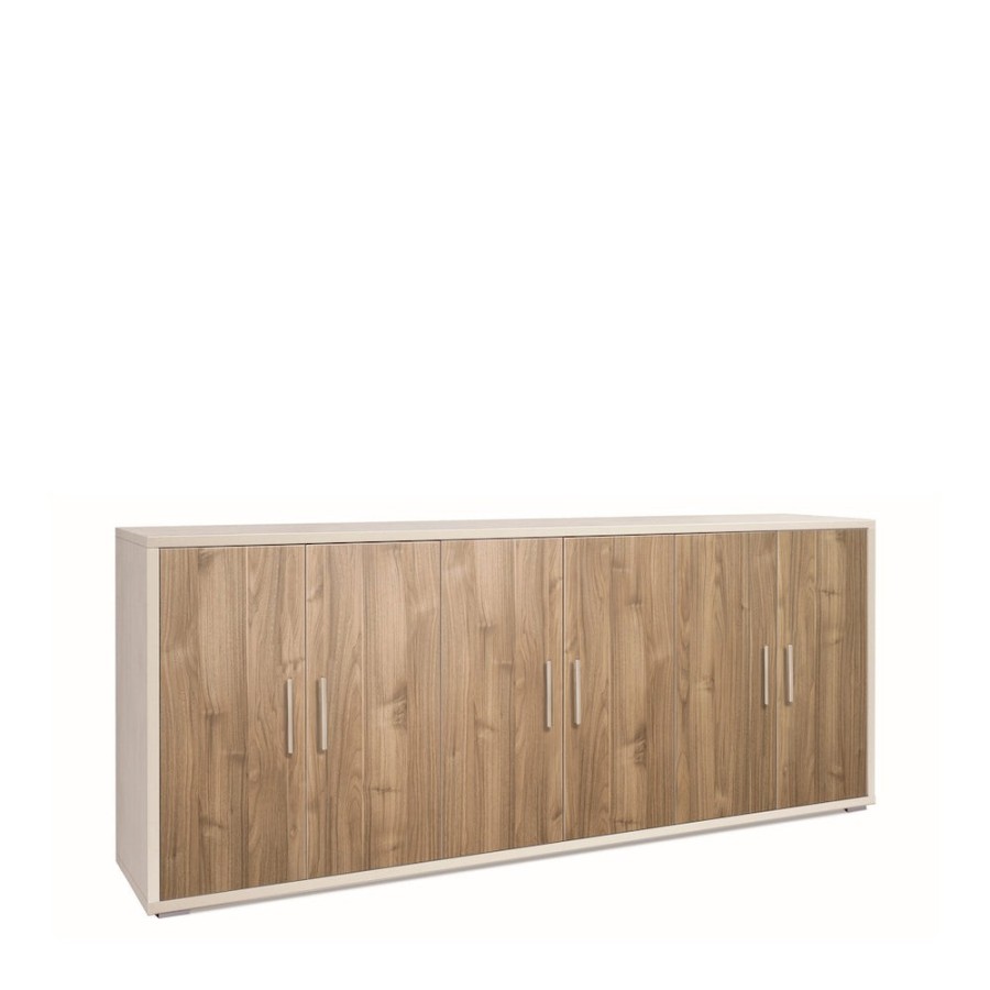 Questa madia a 6 ante imporrà la sua eleganza e il suo carattere grazie alsuo design moderno. Il suo fascino e il suo look senza tempo rendono questo mobile portatutto un classico imperdibile. Dietro le 6 ante si celano 3 ripiani regolabili e amovibili, perfetti per riporre gli oggetti che ami. Il nostro consiglio d'arredo: usa il piano per disporvi i tuoi più bei soprammobili, una bella lampada e qualche pianta. Struttura sp. 25mm e frontali sp. 16mm, fianchi e top a vista. Contiene 3 ripiani regolabili. Maniglie e piedini verniciati cromo satinato. Mobile in kit. Misure: 84x203x41 Colore Struttura/Structure - Frontale/Front: Ossido Bianco / Oxide White - Noce Stelvio / Stelvio Walnut