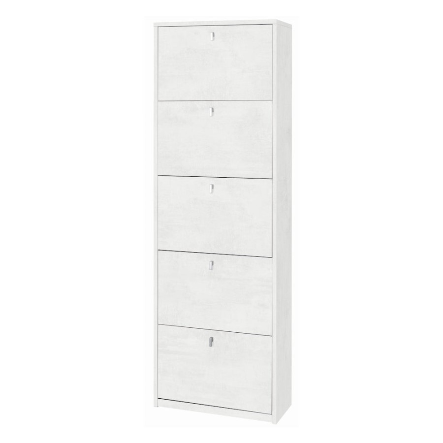 Questa scarpiera non solo ha un bell'aspetto, è anche l'oggetto perfetto per tenere in ordine le tue calzature. Realizzato con una struttura in legno, questo mobile è dotato di cinque ante a ribalta a doppia profondità, con eleganti maniglie satinate e può contenere ben 25 paia di scarpe. Struttura sp. 18mm ed ante sp. 16mm, fianchi e top a vista, bordo ABS senza angolo vivo. Ante a ribalta doppia profondità. Pomoli verniciati cromo platinato. Capacità: 25 paia. Misure: 190x63x29 Colore Struttura/Structure - Frontale/Front: Ossido Bianco / Oxide White - Ossido Bianco / Oxide White