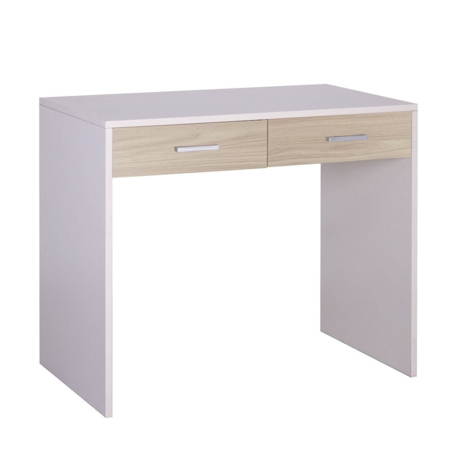 Scrivania moderna adatta ad uno studio casalingo oppure ad una camera da letto. Presenta un design dalle linee semplici ed è adatta ad un ambiente luminoso e moderno. La presenza dei due cassetti sotto al piano superiore è una soluzione molto pratica, dove si può riporre tutto il materiale necessario al lavoro o allo studio in modo ordinato. Struttura sp. 18mm e frontali sp. 16mm. Guide cassetto a rullo. Maniglie verniciate cromo satinato. Mobile in kit. Misure: 76x91x55 Colore Struttura/Structure - Frontale/Front: Bianco Fiammato / White Ash - Olmo Chiaro / Clear Elm