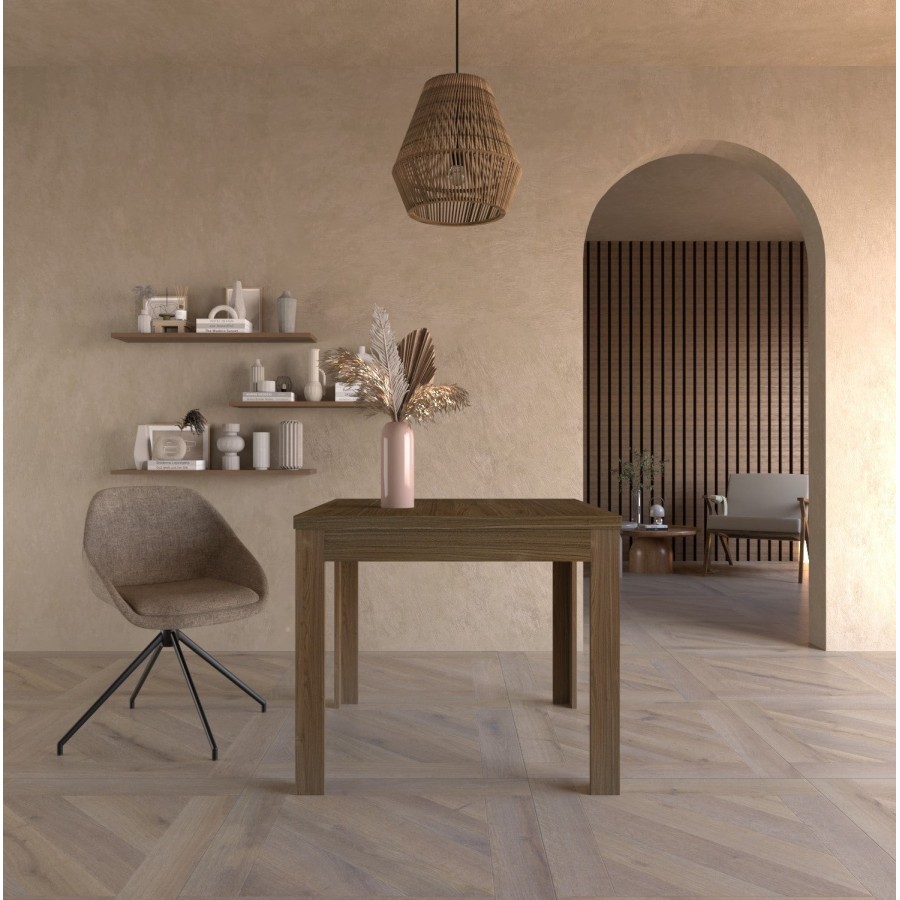 Questo tavolo compatto è perfetto per piccoli spazi come cucine o angoli pranzo. Con dimensioni iniziali di 90x90cm, può essere allungato fino a 180cm per ospitare più ospiti quando necessario. Il design versatile e moderno si adatta bene a vari stili di arredamento, e il piano in melaminico è resistente e facile da pulire. Struttura sp. 18mm. Tavolo con piano doppio con sistema di apertura pieghevole. Mobile in kit di montaggio. Misure: 75x90x90 Colore Struttura/Structure - Frontale/Front: Noce Stelvio / Stelvio Walnut - Noce Stelvio / Stelvio Walnut