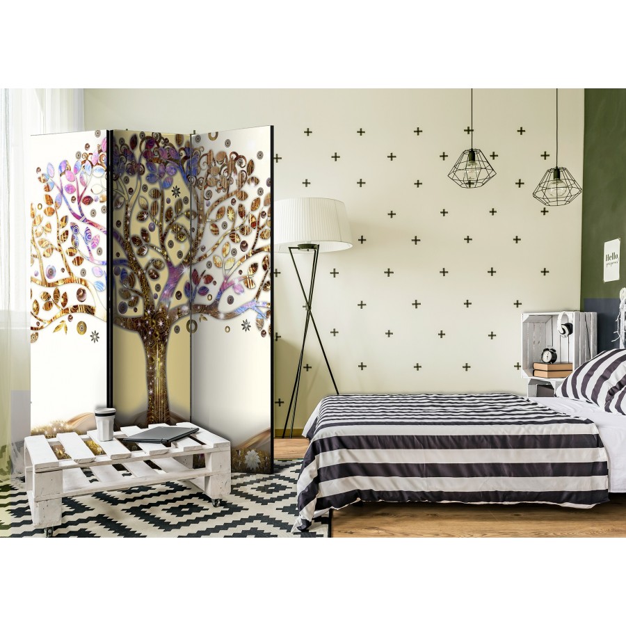Separè decorativo "Paravento - Golden Tree [Room Dividers]" è la decorazione originale per gli interni arredati in stile moderno. Paravento di 3 pannelli fatto del telaio di legno e tela stampata su entrambi i lati non solo può dividere lo spazio ma anche creare un'arrangiamento unico nella stanza. Grazie all'alta qualità del prodotto e della stampa Full HD del disegno originale i separè da interni renderanno ogni stanza affascinante. Paraventi decorativi per interni sono un'idea perfetta per arredare la casa. Vale la pena menzionare le loro funzioni pratiche - separè per interni possono p.es. nascondere lo stendibiancheria. È una decorazione molto originale che si può usare sia negli appartamenti che in locali di servizi come saloni di parrucchiere o di bellezza, studi medici o ristoranti. Separè decorativo è ideale:Come un elemento decorativo o un elemento che divide gli spazi in casaIn un monolocale dividendo la zona giorno dalla zona notteIn camera da letto dove divide la zona notte dalla guardarobaNei boutique e saloni di bellezza - sia come un arrangiamento originale che lo spogliatoio!Per dividere lo spazio nella stanza dei bambiniIn grandi appartamenti e nei loft Dati tecnici Dimensioni delle parti:135x172: 45x172 45x172 45x172