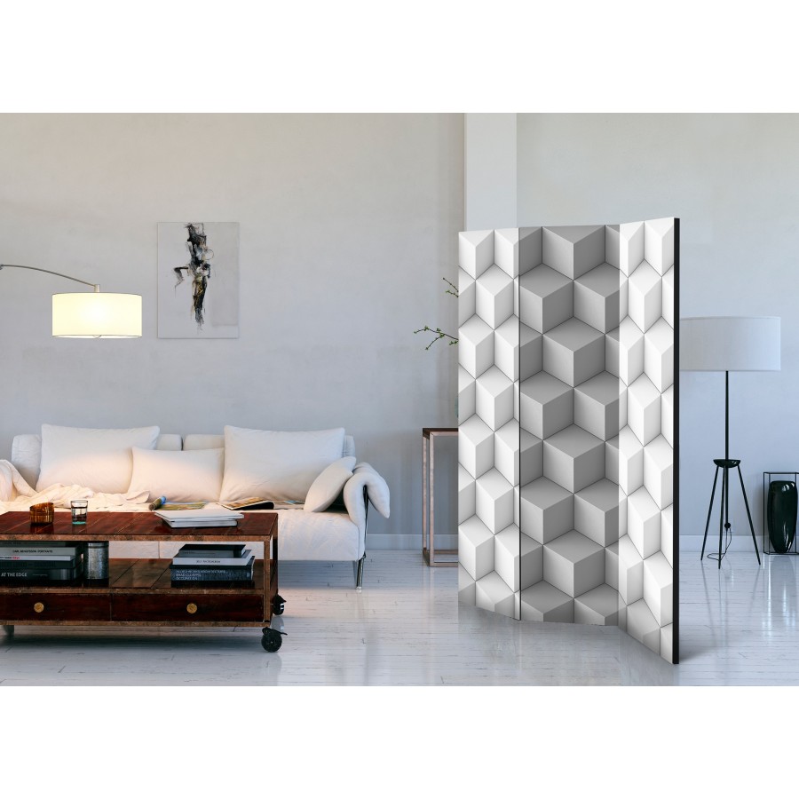 Separè decorativo "Paravento - Room divider – Cube I" è la decorazione originale per gli interni arredati in stile moderno. Paravento di 3 pannelli fatto del telaio di legno e tela stampata su entrambi i lati non solo può dividere lo spazio ma anche creare un'arrangiamento unico nella stanza. Grazie all'alta qualità del prodotto e della stampa Full HD del disegno originale i separè da interni renderanno ogni stanza affascinante. Paraventi decorativi per interni sono un'idea perfetta per arredare la casa. Vale la pena menzionare le loro funzioni pratiche - separè per interni possono p.es. nascondere lo stendibiancheria. È una decorazione molto originale che si può usare sia negli appartamenti che in locali di servizi come saloni di parrucchiere o di bellezza, studi medici o ristoranti. Separè decorativo è ideale:Come un elemento decorativo o un elemento che divide gli spazi in casaIn un monolocale dividendo la zona giorno dalla zona notteIn camera da letto dove divide la zona notte dalla guardarobaNei boutique e saloni di bellezza - sia come un arrangiamento originale che lo spogliatoio!Per dividere lo spazio nella stanza dei bambiniIn grandi appartamenti e nei loft Dati tecnici Dimensioni delle parti:135x172: 45x172 45x172 45x172