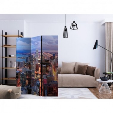 Separè decorativo "Paravento - Illuminated Chicago [Room Dividers]" è la decorazione originale per gli interni arredati in stile moderno. Paravento di 3 pannelli fatto del telaio di legno e tela stampata su entrambi i lati non solo può dividere lo spazio ma anche creare un'arrangiamento unico nella stanza. Grazie all'alta qualità del prodotto e della stampa Full HD del disegno originale i separè da interni renderanno ogni stanza affascinante. Paraventi decorativi per interni sono un'idea perfetta per arredare la casa. Vale la pena menzionare le loro funzioni pratiche - separè per interni possono p.es. nascondere lo stendibiancheria. È una decorazione molto originale che si può usare sia negli appartamenti che in locali di servizi come saloni di parrucchiere o di bellezza, studi medici o ristoranti. Separè decorativo è ideale:Come un elemento decorativo o un elemento che divide gli spazi in casaIn un monolocale dividendo la zona giorno dalla zona notteIn camera da letto dove divide la zona notte dalla guardarobaNei boutique e saloni di bellezza - sia come un arrangiamento originale che lo spogliatoio!Per dividere lo spazio nella stanza dei bambiniIn grandi appartamenti e nei loft Dati tecnici Dimensioni delle parti:135x172: 45x172 45x172 45x172