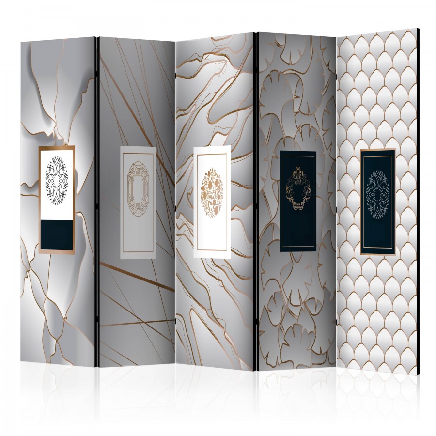 Separè decorativo "Paravento - Labels II [Room Dividers]" è la decorazione originale per gli interni arredati in stile moderno. Paravento di 5 pannelli fatto del telaio di legno e tela stampata su entrambi i lati non solo può dividere lo spazio ma anche creare un'arrangiamento unico nella stanza. Grazie all'alta qualità del prodotto e della stampa Full HD del disegno originale i separè da interni renderanno ogni stanza affascinante. Paraventi decorativi per interni sono un'idea perfetta per arredare la casa. Vale la pena menzionare le loro funzioni pratiche - separè per interni possono p.es. nascondere lo stendibiancheria. È una decorazione molto originale che si può usare sia negli appartamenti che in locali di servizi come saloni di parrucchiere o di bellezza, studi medici o ristoranti. Separè decorativo è ideale: Come un elemento decorativo o un elemento che divide gli spazi in casa In un monolocale dividendo la zona giorno dalla zona notte In camera da letto dove divide la zona notte dalla guardaroba Nei boutique e saloni di bellezza - sia come un arrangiamento originale che lo spogliatoio! Per dividere lo spazio nella stanza dei bambini In grandi appartamenti e nei loft Dati tecnici Dimensioni delle parti:225x172: 45x172 45x172 45x172 45x172 45x172