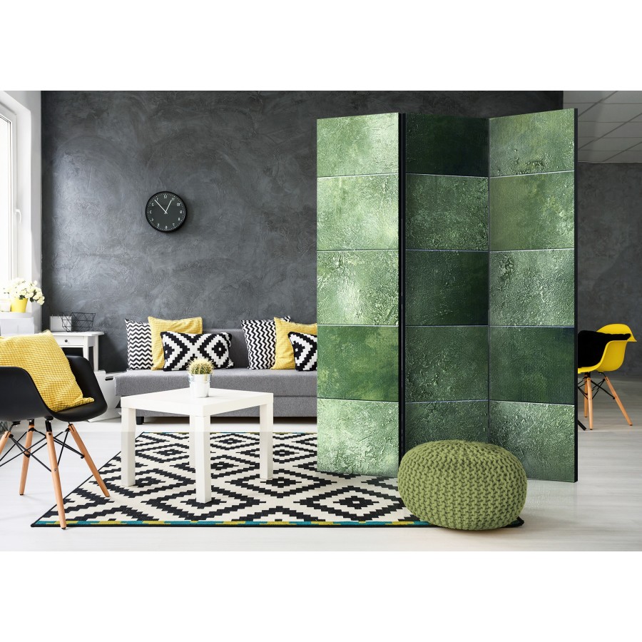 Separè decorativo "Paravento - Green Puzzle [Room Dividers]" è la decorazione originale per gli interni arredati in stile moderno. Paravento di 3 pannelli fatto del telaio di legno e tela stampata su entrambi i lati non solo può dividere lo spazio ma anche creare un'arrangiamento unico nella stanza. Grazie all'alta qualità del prodotto e della stampa Full HD del disegno originale i separè da interni renderanno ogni stanza affascinante. Paraventi decorativi per interni sono un'idea perfetta per arredare la casa. Vale la pena menzionare le loro funzioni pratiche - separè per interni possono p.es. nascondere lo stendibiancheria. È una decorazione molto originale che si può usare sia negli appartamenti che in locali di servizi come saloni di parrucchiere o di bellezza, studi medici o ristoranti. Separè decorativo è ideale:Come un elemento decorativo o un elemento che divide gli spazi in casaIn un monolocale dividendo la zona giorno dalla zona notteIn camera da letto dove divide la zona notte dalla guardarobaNei boutique e saloni di bellezza - sia come un arrangiamento originale che lo spogliatoio!Per dividere lo spazio nella stanza dei bambiniIn grandi appartamenti e nei loft Dati tecnici Dimensioni delle parti:135x172: 45x172 45x172 45x172