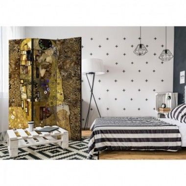 Separè decorativo "Paravento - Golden Kiss [Room Dividers]" è la decorazione originale per gli interni arredati in stile moderno. Paravento di 3 pannelli fatto del telaio di legno e tela stampata su entrambi i lati non solo può dividere lo spazio ma anche creare un'arrangiamento unico nella stanza. Grazie all'alta qualità del prodotto e della stampa Full HD del disegno originale i separè da interni renderanno ogni stanza affascinante. Paraventi decorativi per interni sono un'idea perfetta per arredare la casa. Vale la pena menzionare le loro funzioni pratiche - separè per interni possono p.es. nascondere lo stendibiancheria. È una decorazione molto originale che si può usare sia negli appartamenti che in locali di servizi come saloni di parrucchiere o di bellezza, studi medici o ristoranti. Separè decorativo è ideale:Come un elemento decorativo o un elemento che divide gli spazi in casaIn un monolocale dividendo la zona giorno dalla zona notteIn camera da letto dove divide la zona notte dalla guardarobaNei boutique e saloni di bellezza - sia come un arrangiamento originale che lo spogliatoio!Per dividere lo spazio nella stanza dei bambiniIn grandi appartamenti e nei loft Dati tecnici Dimensioni delle parti:135x172: 45x172 45x172 45x172