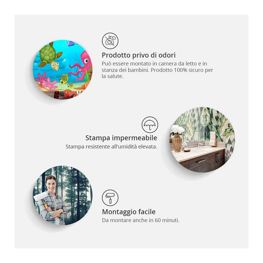 Durevole, resistente all'acqua ed ai graffi fotomurale di fliselina "Fotomurale - Pink Manor" da montare sulla parete. Fotomurale "Fotomurale - Pink Manor" con un disegno eccezionale darà un effetto impressionante ad ogni stanza. Il materiale Tessuto Non Tessuto viene montato con la colla. Può essere montato in ogni stanza, anche in bagno e in cucina. Carta da parati 100% fliselina e la superficie semi-opaca nascondono le imperfezioni del muro. Crea uno strato isolante dal freddo e permette ai muri di respirare. Stampa impermeabile è molto resistente. Stampa di alta qualità La qualità di stampa digitale con la risoluzione fino a 600 dpi in tecnica speciale e i colori vivaci del fotomurale renderanno la tua stanza più grande. Ecologico e sicuro Grazie all'utilizzo dei materiali sicuri consigliamo i nostri prodotti anche per la camera da letto e la cameretta. Imballaggio sicuro Il fotomurale è in rotolo ed è imballato nel cartone che lo protegge durante il trasporto. Ogni pacco contiene l'istruzione del montaggio. Montaggio facile La divisione del fotomurale in strisce larghe di 50 cm rende l'applicazione molto facile. Guardi come montare il fotomurale passo dopo passo. Scarica istruzioni Peso: 120 g/m2 Largezza di 1 rotolo :50 cm Tecnologia di stampa: laser (stampa termoindurente) Dimensioni delle parti:100x70: 50x70 50x70150x105: 50x105 50x105 50x105200x140: 50x140 50x140 50x140 50x140250x175: 50x175 50x175 50x175 50x175 50x175300x210: 50x210 50x210 50x210 50x210 50x210 50x210350x245: 50x245 50x245 50x245 50x245 50x245 50x245 50x245400x280: 50x280 50x280 50x280 50x280 50x280 50x280 50x280 50x280