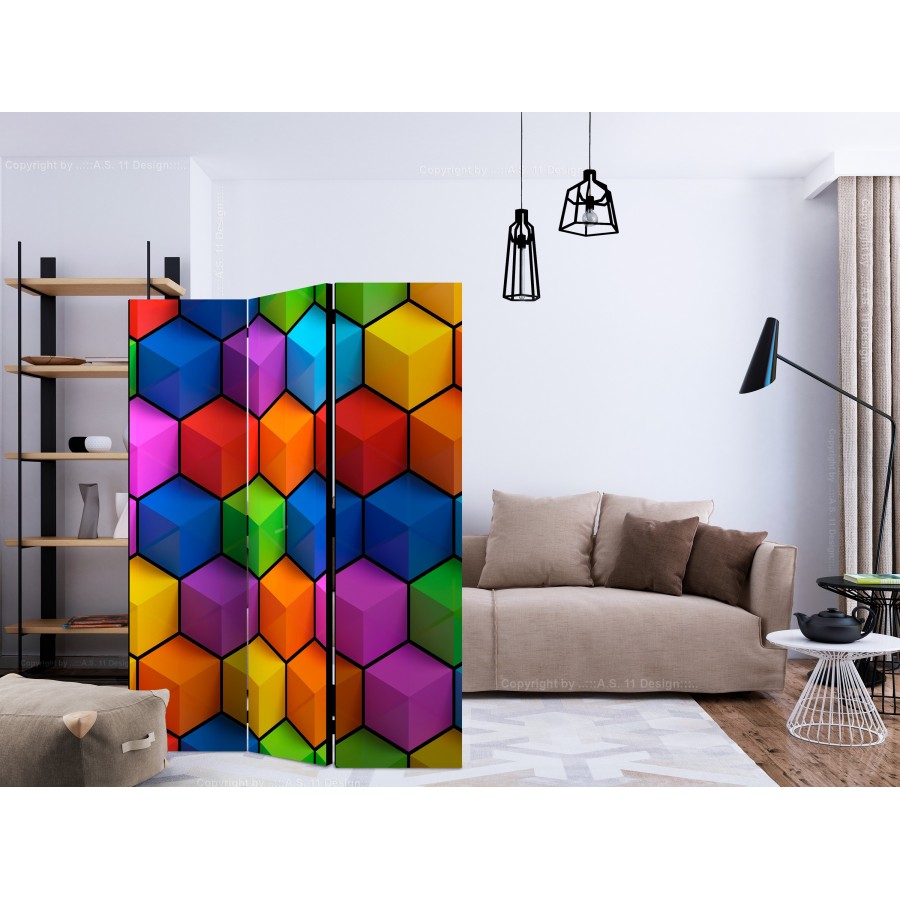 Separè decorativo "Paravento - Rainbow Geometry [Room Dividers]" è la decorazione originale per gli interni arredati in stile moderno. Paravento di 3 pannelli fatto del telaio di legno e tela stampata su entrambi i lati non solo può dividere lo spazio ma anche creare un'arrangiamento unico nella stanza. Grazie all'alta qualità del prodotto e della stampa Full HD del disegno originale i separè da interni renderanno ogni stanza affascinante. Paraventi decorativi per interni sono un'idea perfetta per arredare la casa. Vale la pena menzionare le loro funzioni pratiche - separè per interni possono p.es. nascondere lo stendibiancheria. È una decorazione molto originale che si può usare sia negli appartamenti che in locali di servizi come saloni di parrucchiere o di bellezza, studi medici o ristoranti. Separè decorativo è ideale:Come un elemento decorativo o un elemento che divide gli spazi in casaIn un monolocale dividendo la zona giorno dalla zona notteIn camera da letto dove divide la zona notte dalla guardarobaNei boutique e saloni di bellezza - sia come un arrangiamento originale che lo spogliatoio!Per dividere lo spazio nella stanza dei bambiniIn grandi appartamenti e nei loft Dati tecnici Dimensioni delle parti:135x172: 45x172 45x172 45x172