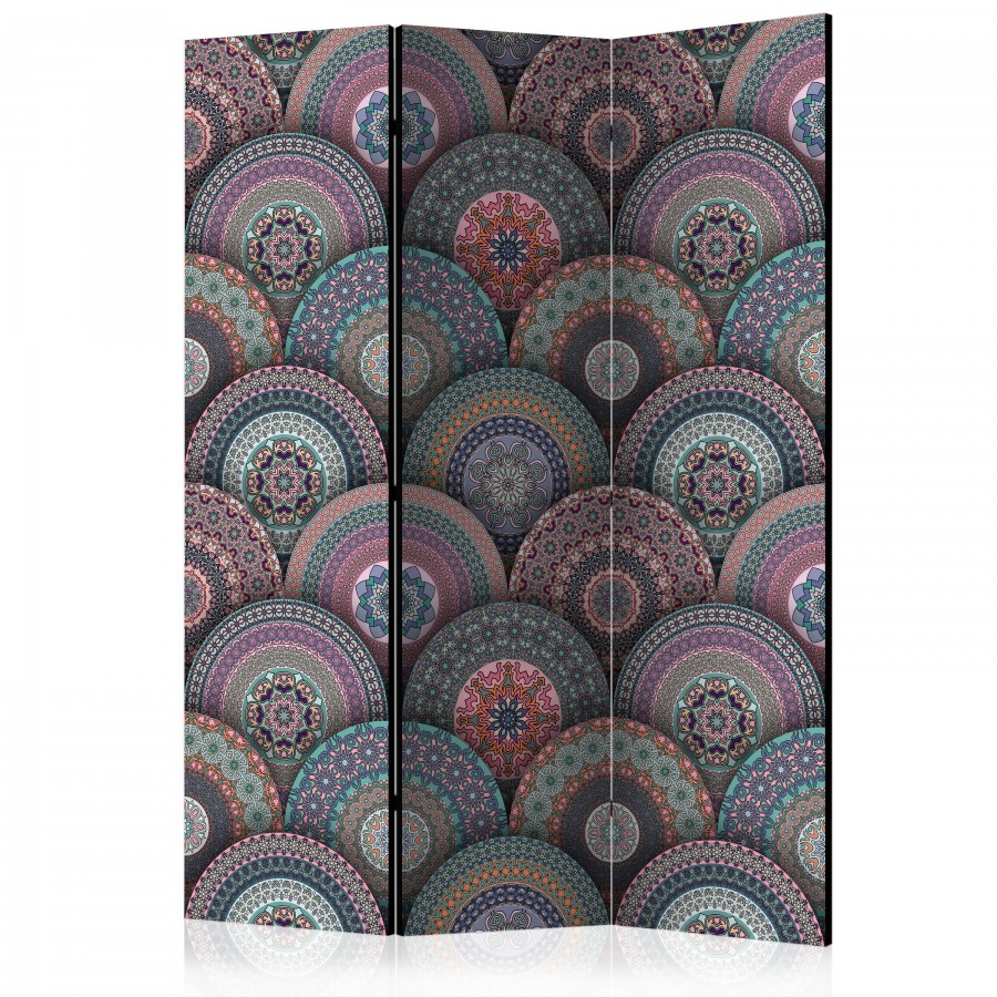 Separè decorativo "Paravento - Oriental Kaleidoscope [Room Dividers]" è la decorazione originale per gli interni arredati in stile moderno. Paravento di 3 pannelli fatto del telaio di legno e tela stampata su entrambi i lati non solo può dividere lo spazio ma anche creare un'arrangiamento unico nella stanza. Grazie all'alta qualità del prodotto e della stampa Full HD del disegno originale i separè da interni renderanno ogni stanza affascinante. Paraventi decorativi per interni sono un'idea perfetta per arredare la casa. Vale la pena menzionare le loro funzioni pratiche - separè per interni possono p.es. nascondere lo stendibiancheria. È una decorazione molto originale che si può usare sia negli appartamenti che in locali di servizi come saloni di parrucchiere o di bellezza, studi medici o ristoranti. Separè decorativo è ideale:Come un elemento decorativo o un elemento che divide gli spazi in casaIn un monolocale dividendo la zona giorno dalla zona notteIn camera da letto dove divide la zona notte dalla guardarobaNei boutique e saloni di bellezza - sia come un arrangiamento originale che lo spogliatoio!Per dividere lo spazio nella stanza dei bambiniIn grandi appartamenti e nei loft Dati tecnici Dimensioni delle parti:135x172: 45x172 45x172 45x172