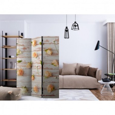 Separè decorativo "Paravento - Wood & Roses [Room Dividers]" è la decorazione originale per gli interni arredati in stile moderno. Paravento di 3 pannelli fatto del telaio di legno e tela stampata su entrambi i lati non solo può dividere lo spazio ma anche creare un'arrangiamento unico nella stanza. Grazie all'alta qualità del prodotto e della stampa Full HD del disegno originale i separè da interni renderanno ogni stanza affascinante. Paraventi decorativi per interni sono un'idea perfetta per arredare la casa. Vale la pena menzionare le loro funzioni pratiche - separè per interni possono p.es. nascondere lo stendibiancheria. È una decorazione molto originale che si può usare sia negli appartamenti che in locali di servizi come saloni di parrucchiere o di bellezza, studi medici o ristoranti. Separè decorativo è ideale:Come un elemento decorativo o un elemento che divide gli spazi in casaIn un monolocale dividendo la zona giorno dalla zona notteIn camera da letto dove divide la zona notte dalla guardarobaNei boutique e saloni di bellezza - sia come un arrangiamento originale che lo spogliatoio!Per dividere lo spazio nella stanza dei bambiniIn grandi appartamenti e nei loft Dati tecnici Dimensioni delle parti:135x172: 45x172 45x172 45x172