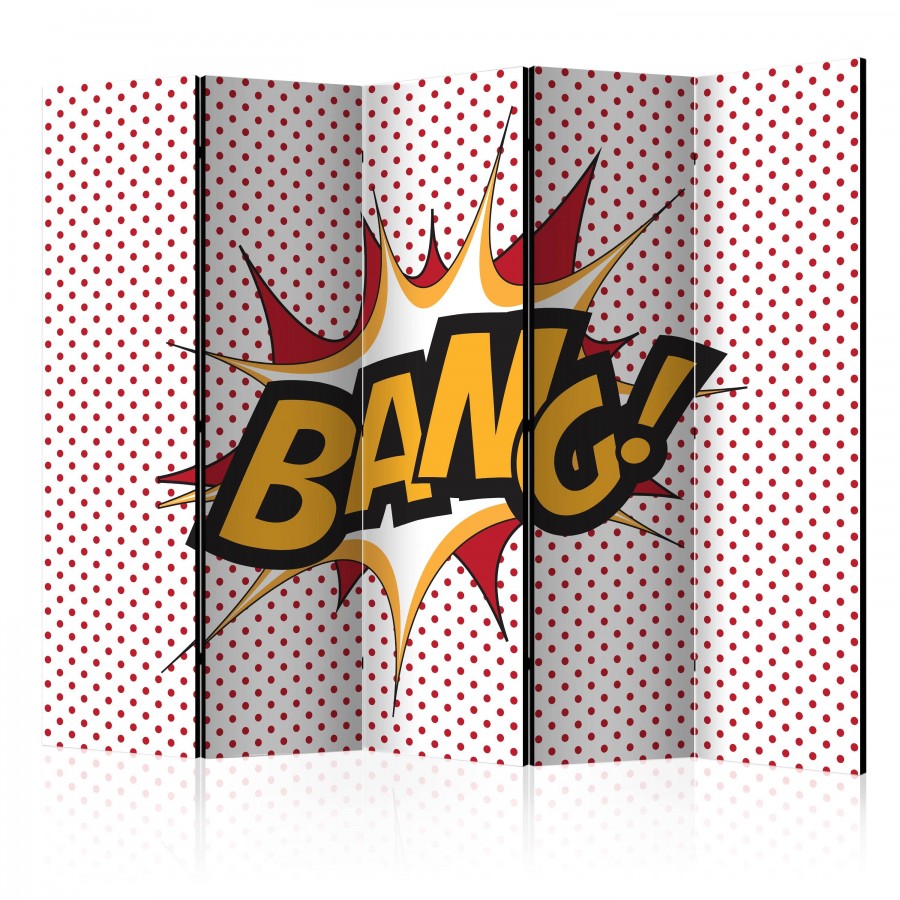 Separè decorativo "Paravento - BANG! II [Room Dividers]" è la decorazione originale per gli interni arredati in stile moderno. Paravento di 5 pannelli fatto del telaio di legno e tela stampata su entrambi i lati non solo può dividere lo spazio ma anche creare un'arrangiamento unico nella stanza. Grazie all'alta qualità del prodotto e della stampa Full HD del disegno originale i separè da interni renderanno ogni stanza affascinante. Paraventi decorativi per interni sono un'idea perfetta per arredare la casa. Vale la pena menzionare le loro funzioni pratiche - separè per interni possono p.es. nascondere lo stendibiancheria. È una decorazione molto originale che si può usare sia negli appartamenti che in locali di servizi come saloni di parrucchiere o di bellezza, studi medici o ristoranti. Separè decorativo è ideale: Come un elemento decorativo o un elemento che divide gli spazi in casa In un monolocale dividendo la zona giorno dalla zona notte In camera da letto dove divide la zona notte dalla guardaroba Nei boutique e saloni di bellezza - sia come un arrangiamento originale che lo spogliatoio! Per dividere lo spazio nella stanza dei bambini In grandi appartamenti e nei loft Dati tecnici Dimensioni delle parti:225x172: 45x172 45x172 45x172 45x172 45x172