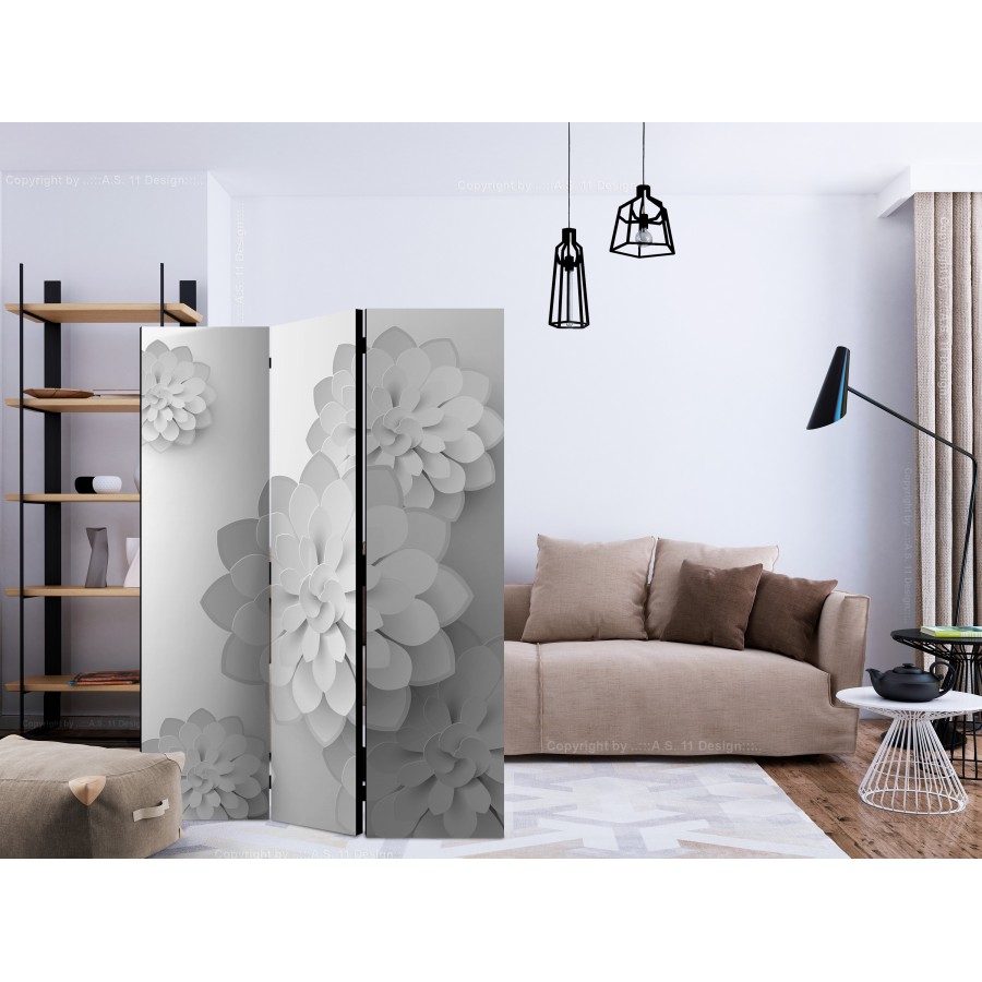 Separè decorativo "Paravento - White Garden [Room Dividers]" è la decorazione originale per gli interni arredati in stile moderno. Paravento di 3 pannelli fatto del telaio di legno e tela stampata su entrambi i lati non solo può dividere lo spazio ma anche creare un'arrangiamento unico nella stanza. Grazie all'alta qualità del prodotto e della stampa Full HD del disegno originale i separè da interni renderanno ogni stanza affascinante. Paraventi decorativi per interni sono un'idea perfetta per arredare la casa. Vale la pena menzionare le loro funzioni pratiche - separè per interni possono p.es. nascondere lo stendibiancheria. È una decorazione molto originale che si può usare sia negli appartamenti che in locali di servizi come saloni di parrucchiere o di bellezza, studi medici o ristoranti. Separè decorativo è ideale:Come un elemento decorativo o un elemento che divide gli spazi in casaIn un monolocale dividendo la zona giorno dalla zona notteIn camera da letto dove divide la zona notte dalla guardarobaNei boutique e saloni di bellezza - sia come un arrangiamento originale che lo spogliatoio!Per dividere lo spazio nella stanza dei bambiniIn grandi appartamenti e nei loft Dati tecnici Dimensioni delle parti:135x172: 45x172 45x172 45x172