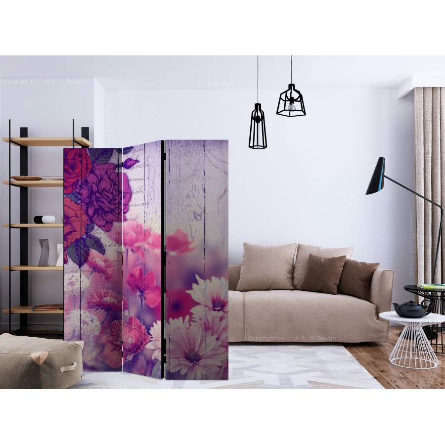 Separè decorativo "Paravento - Flowers Memories [Room Dividers]" è la decorazione originale per gli interni arredati in stile moderno. Paravento di 3 pannelli fatto del telaio di legno e tela stampata su entrambi i lati non solo può dividere lo spazio ma anche creare un'arrangiamento unico nella stanza. Grazie all'alta qualità del prodotto e della stampa Full HD del disegno originale i separè da interni renderanno ogni stanza affascinante. Paraventi decorativi per interni sono un'idea perfetta per arredare la casa. Vale la pena menzionare le loro funzioni pratiche - separè per interni possono p.es. nascondere lo stendibiancheria. È una decorazione molto originale che si può usare sia negli appartamenti che in locali di servizi come saloni di parrucchiere o di bellezza, studi medici o ristoranti. Separè decorativo è ideale:Come un elemento decorativo o un elemento che divide gli spazi in casaIn un monolocale dividendo la zona giorno dalla zona notteIn camera da letto dove divide la zona notte dalla guardarobaNei boutique e saloni di bellezza - sia come un arrangiamento originale che lo spogliatoio!Per dividere lo spazio nella stanza dei bambiniIn grandi appartamenti e nei loft Dati tecnici Dimensioni delle parti:135x172: 45x172 45x172 45x172