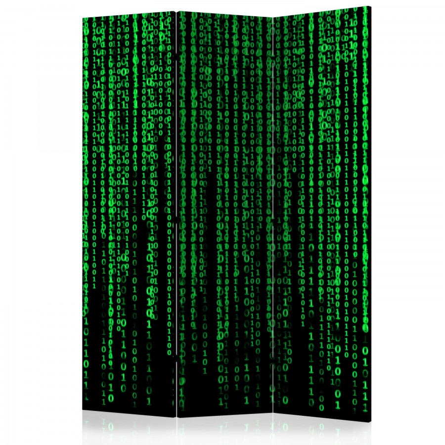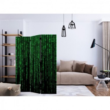 Separè decorativo "Paravento - Digital Rain [Room Dividers]" è la decorazione originale per gli interni arredati in stile moderno. Paravento di 3 pannelli fatto del telaio di legno e tela stampata su entrambi i lati non solo può dividere lo spazio ma anche creare un'arrangiamento unico nella stanza. Grazie all'alta qualità del prodotto e della stampa Full HD del disegno originale i separè da interni renderanno ogni stanza affascinante. Paraventi decorativi per interni sono un'idea perfetta per arredare la casa. Vale la pena menzionare le loro funzioni pratiche - separè per interni possono p.es. nascondere lo stendibiancheria. È una decorazione molto originale che si può usare sia negli appartamenti che in locali di servizi come saloni di parrucchiere o di bellezza, studi medici o ristoranti. Separè decorativo è ideale:Come un elemento decorativo o un elemento che divide gli spazi in casaIn un monolocale dividendo la zona giorno dalla zona notteIn camera da letto dove divide la zona notte dalla guardarobaNei boutique e saloni di bellezza - sia come un arrangiamento originale che lo spogliatoio!Per dividere lo spazio nella stanza dei bambiniIn grandi appartamenti e nei loft Dati tecnici Dimensioni delle parti:135x172: 45x172 45x172 45x172
