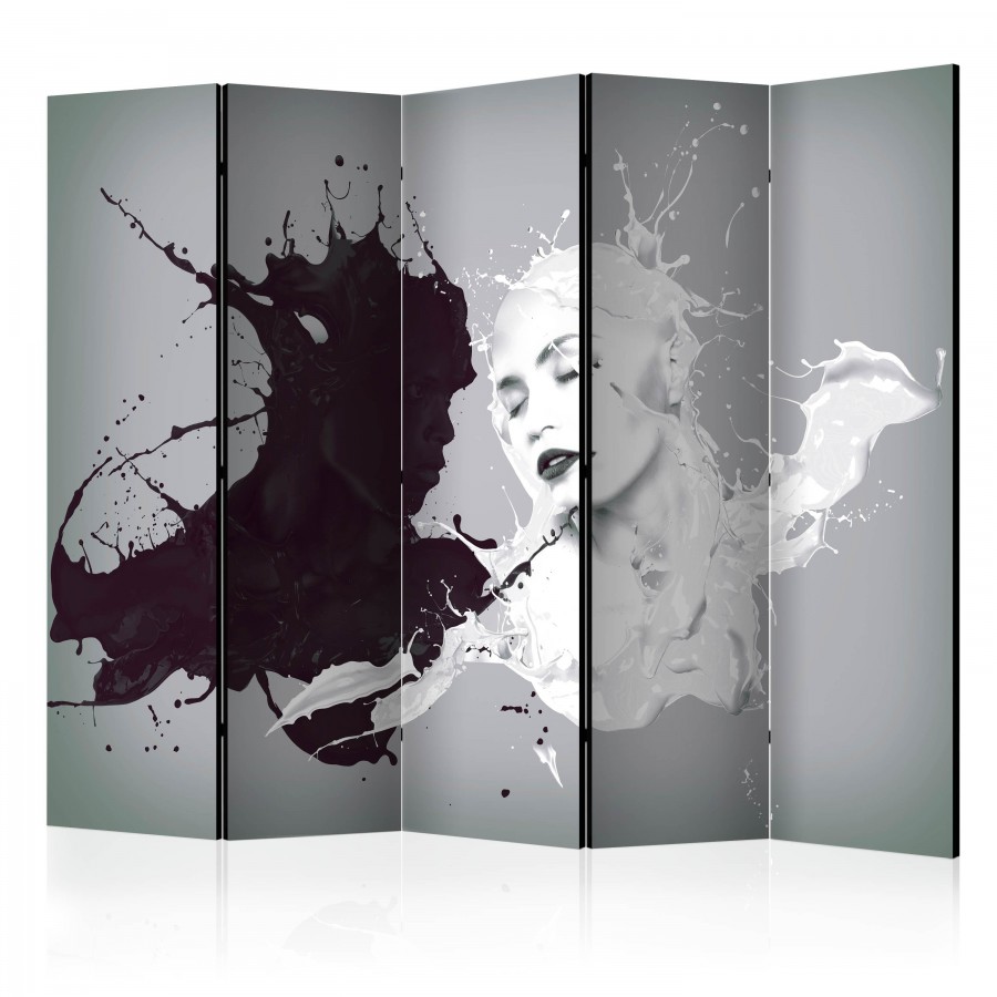 Separè decorativo "Paravento - Dissonance II [Room Dividers]" è la decorazione originale per gli interni arredati in stile moderno. Paravento di 5 pannelli fatto del telaio di legno e tela stampata su entrambi i lati non solo può dividere lo spazio ma anche creare un'arrangiamento unico nella stanza. Grazie all'alta qualità del prodotto e della stampa Full HD del disegno originale i separè da interni renderanno ogni stanza affascinante. Paraventi decorativi per interni sono un'idea perfetta per arredare la casa. Vale la pena menzionare le loro funzioni pratiche - separè per interni possono p.es. nascondere lo stendibiancheria. È una decorazione molto originale che si può usare sia negli appartamenti che in locali di servizi come saloni di parrucchiere o di bellezza, studi medici o ristoranti. Separè decorativo è ideale: Come un elemento decorativo o un elemento che divide gli spazi in casa In un monolocale dividendo la zona giorno dalla zona notte In camera da letto dove divide la zona notte dalla guardaroba Nei boutique e saloni di bellezza - sia come un arrangiamento originale che lo spogliatoio! Per dividere lo spazio nella stanza dei bambini In grandi appartamenti e nei loft Dati tecnici Dimensioni delle parti:225x172: 45x172 45x172 45x172 45x172 45x172