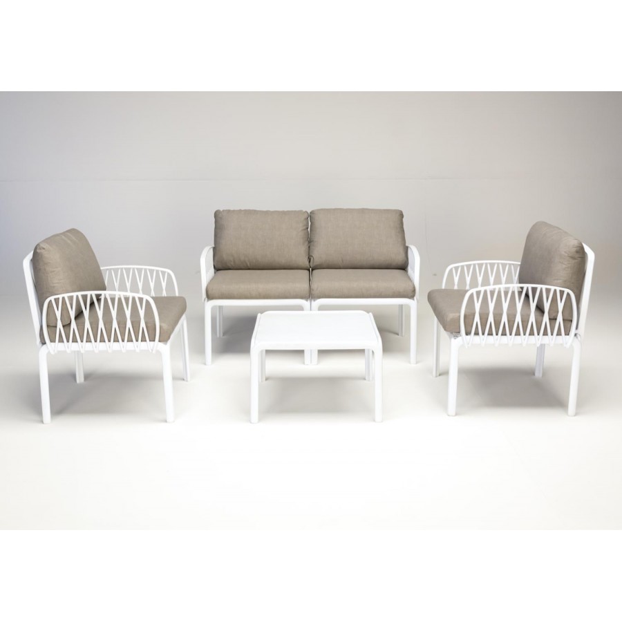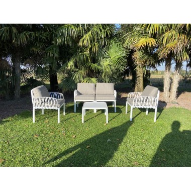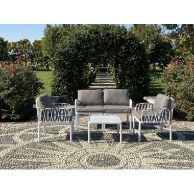 Una proposta completa e funzionale composta da un comodo divano a due posti, 2 profonde ed avvolgenti poltrone e un pratico tavolino. La struttura di questi eleganti complementi di arredo da esterno è realizzata in polipropilene e fiberglass. Per garantire il massimo confort il set viene fornito con 4 bellissimi cuscini seduta e 4 schienale prodotti in policotone resistenti all'acqua. I cuscini sono sfoderabili e lavabili ad una temperatura max. 30°.