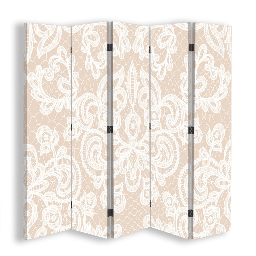 Tela tesa su una cornice solida in MDF/legno. I divisori sono dotati di cerniere in metallo e pratici piedini che proteggono il pavimento dai graffi.