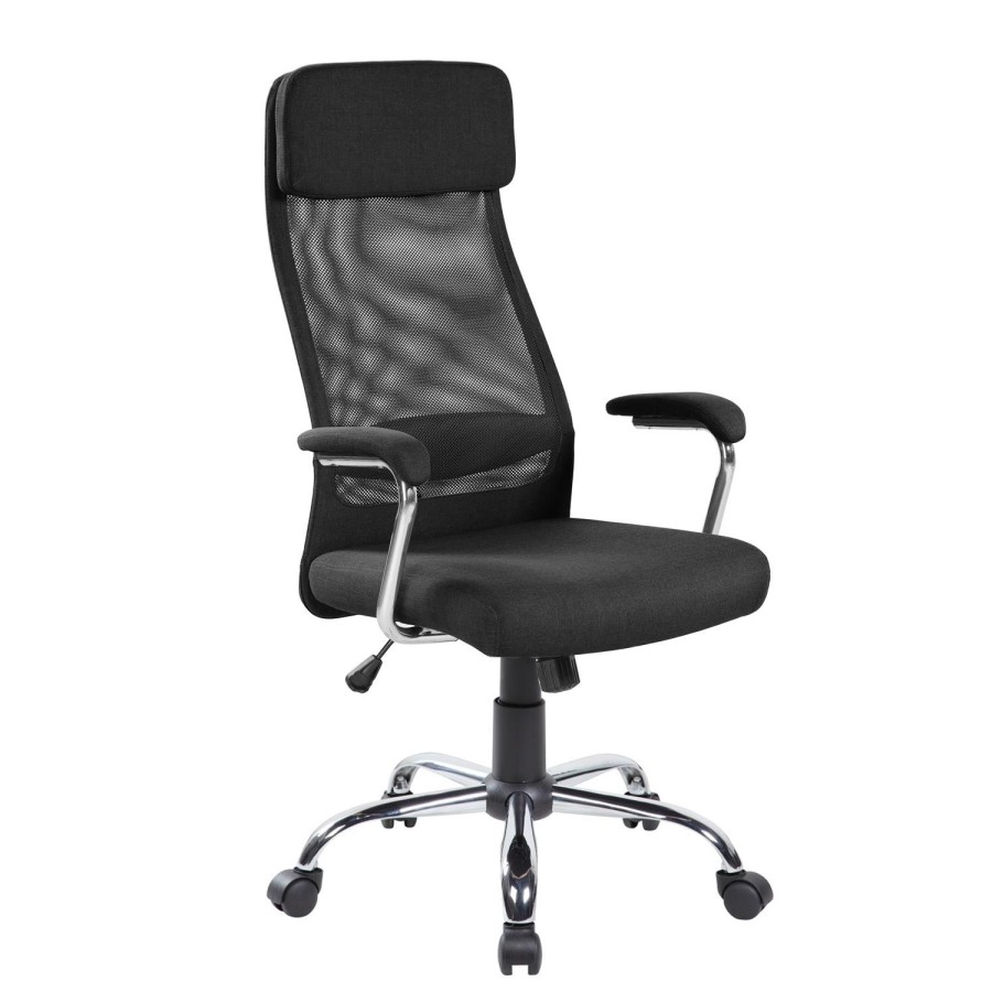 Rivestimento in rete tecnica traspirante Razze in acciaio cromato con ruote piroettanti Sistema di elevazione a gas per la regolazione del sedile in altezza. Meccanismo oscillante bloccabile Regolazione di tensione della spinta Dimensioni: cm L65 x P65 x H114/125 Colore: Nero