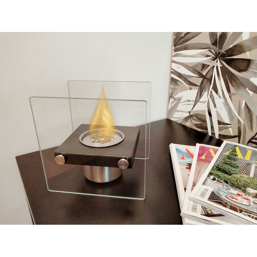 Camino a bioetanolo da tavolo, composto da due vetri resistenti al calore, un porta bruciatore in acciaio, un bruciatore tondo da 0,4 litri e uno spegnifiamma.
