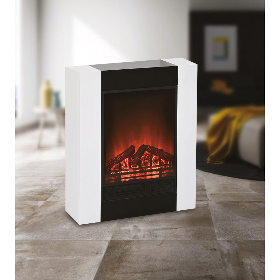 La stufa elettrica Moderna è composto da un mantello in legno MDF verniciato di bianco e un inserto elettrico in acciaio e vetro.