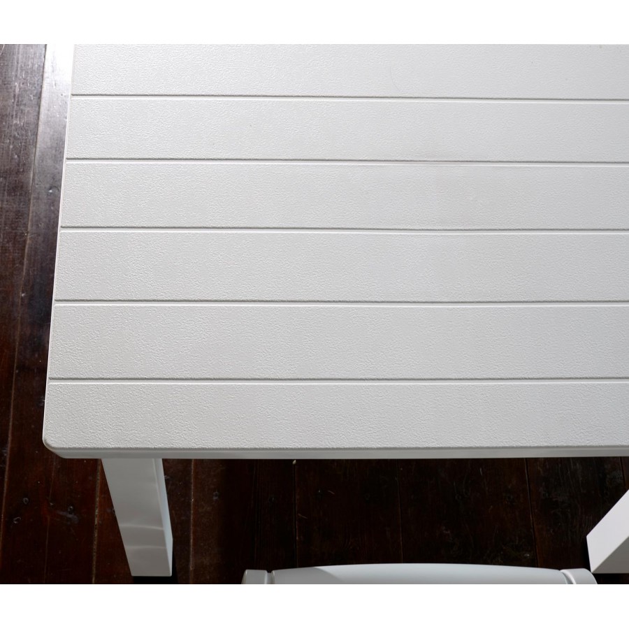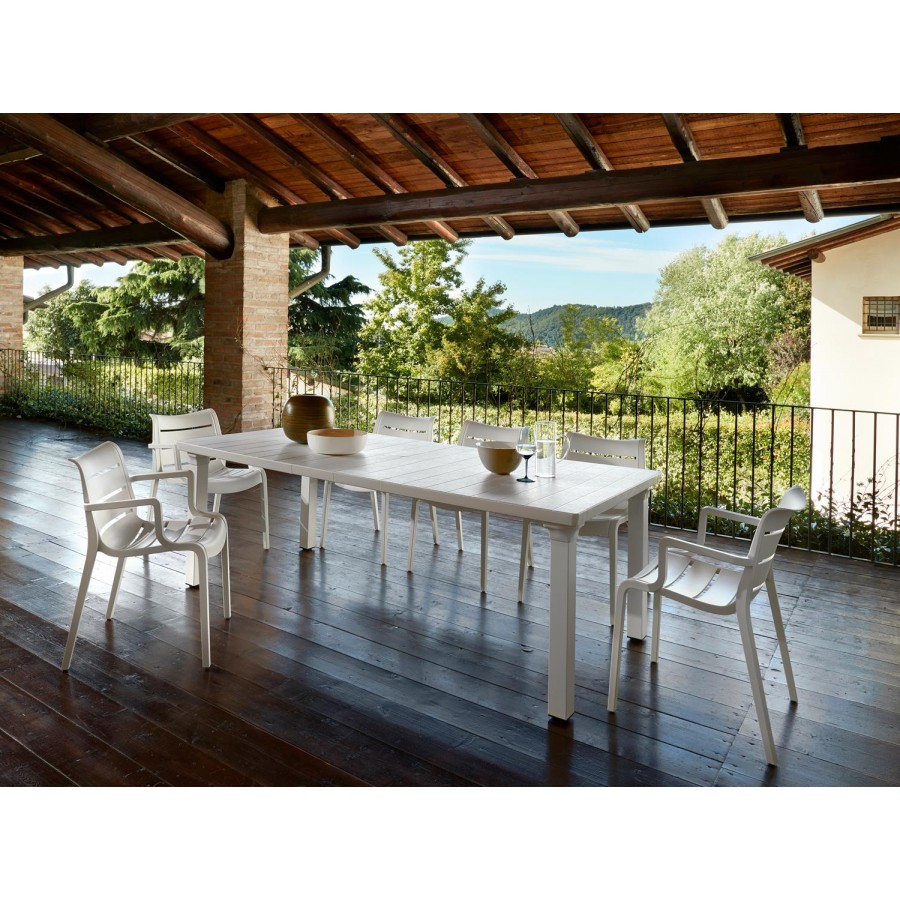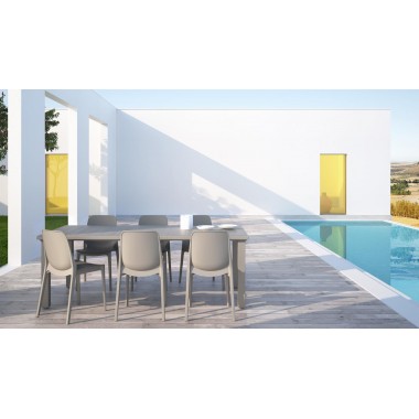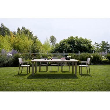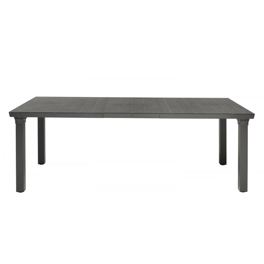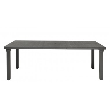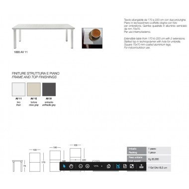 Tavolo allungabile da 170 a 220 cm con 2 prolunghe. Piano in tecnopolimero a effetto doghe con foro per ombrellone. Gambe quadrate in alluminio verniciato da 70×70 mm. Per uso interno/esterno